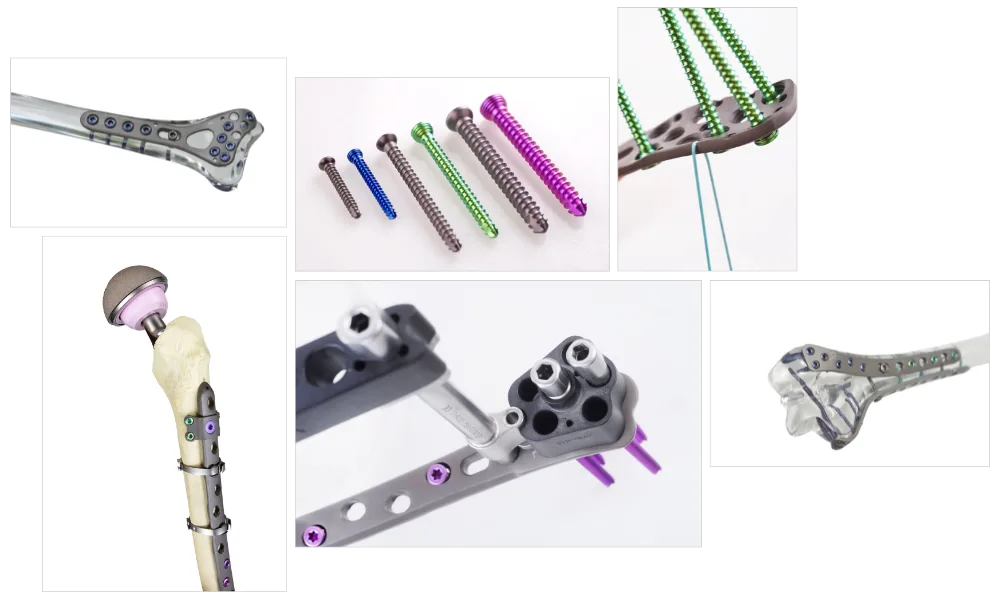 The anodised titanium plateing system has been given a several features to improve patient safety and to speed up the healing process; the edges of the plates are rounded for soft tissue protection, the near-joint sections are thinned and the ends of the self-tapping screws are blunted. Additionally, for the larger plates, X-ray permeable carbon targeting arms enable a minimally invasive surgical technique.